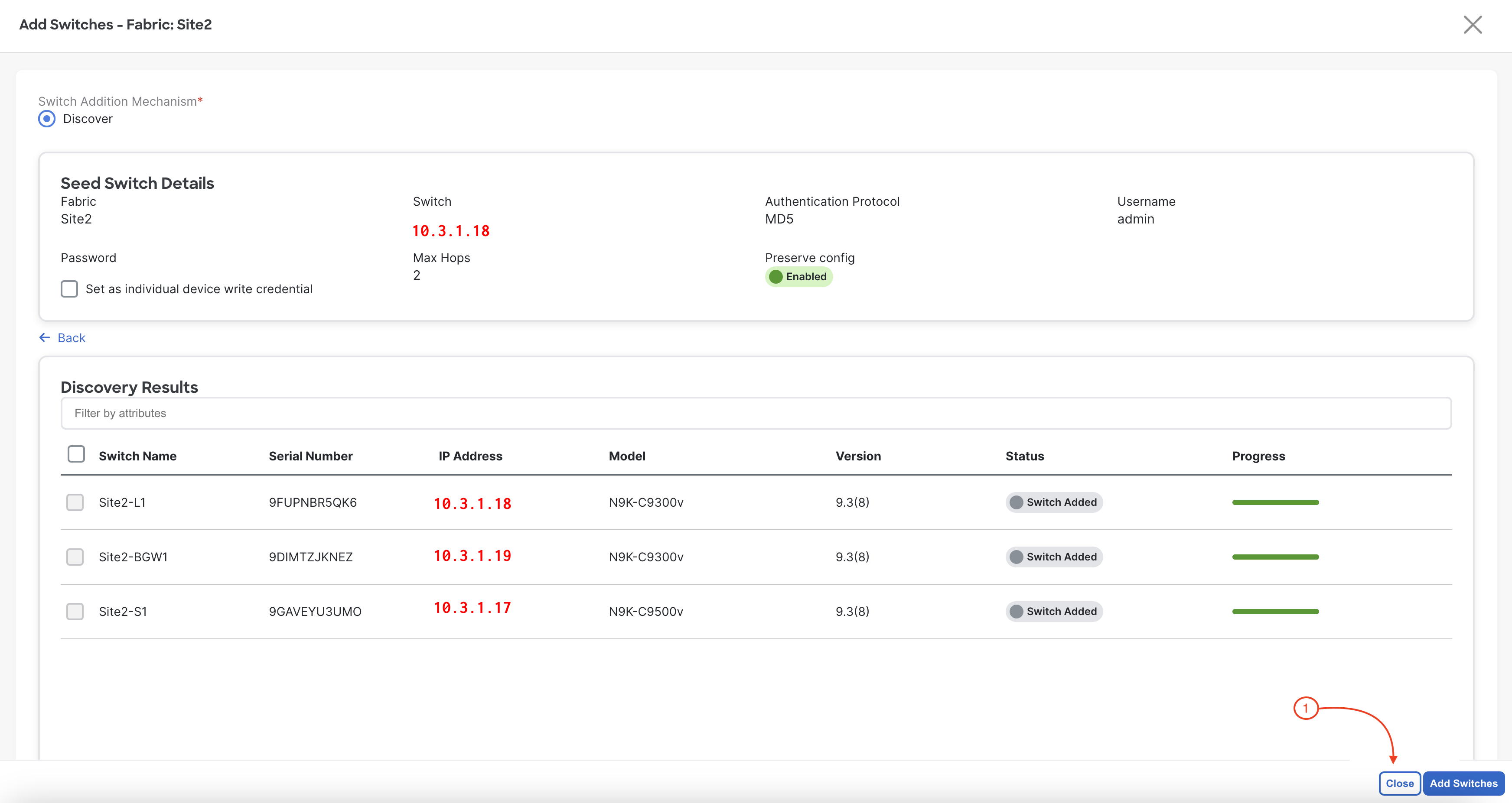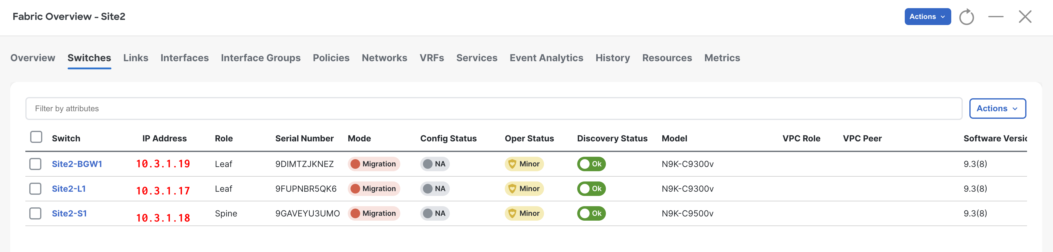You discovered and imported all Site2 switches into Nexus Dashboard with "Preserve Config" enabled — the key difference from Greenfield. ND detected the existing configurations on each switch and will reconcile them during deployment rather than overwriting them. This Brownfield capability means you can adopt ND in live production environments with zero disruption.