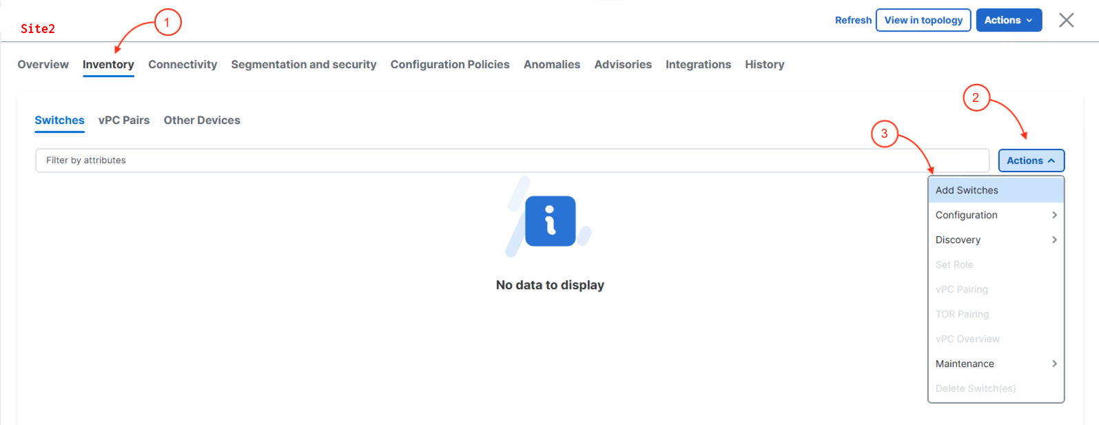 Your Switches table is empty at the moment. To populate it with the switches in your Site1 fabric: