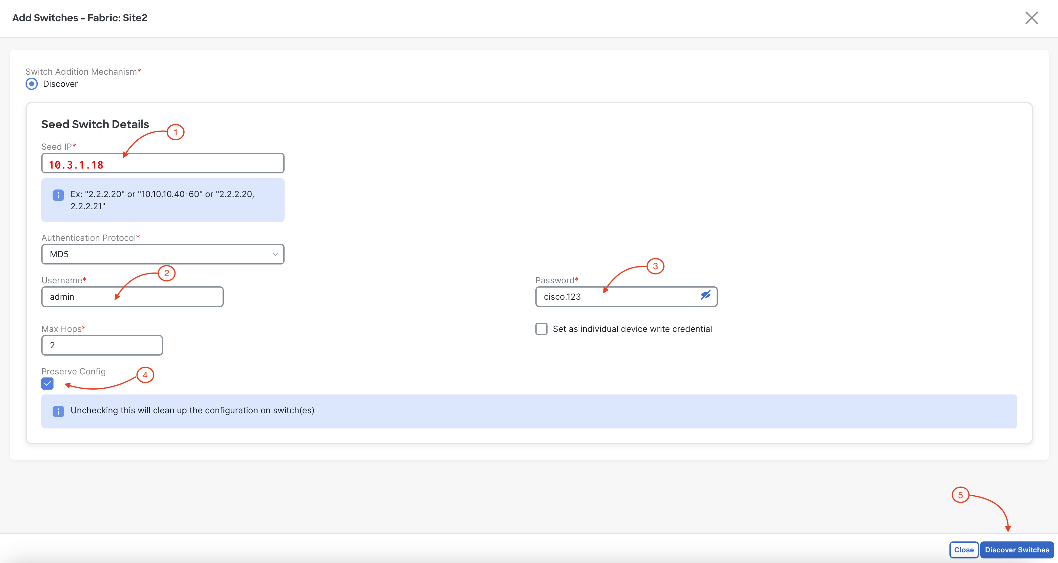 The Add Switches wizard needs some information to automaticaly be able to discover and add switches for management by Nexus Dashboard. Also, since this is a Brownfield fabric, the Preserve Config checkbox will remain checked :