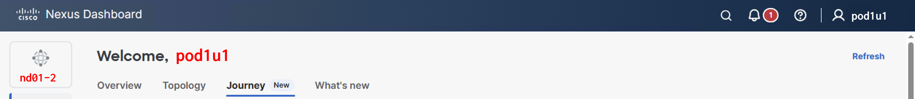 Upon successful login, the user interface should display your username, pod1u1, as shown below.