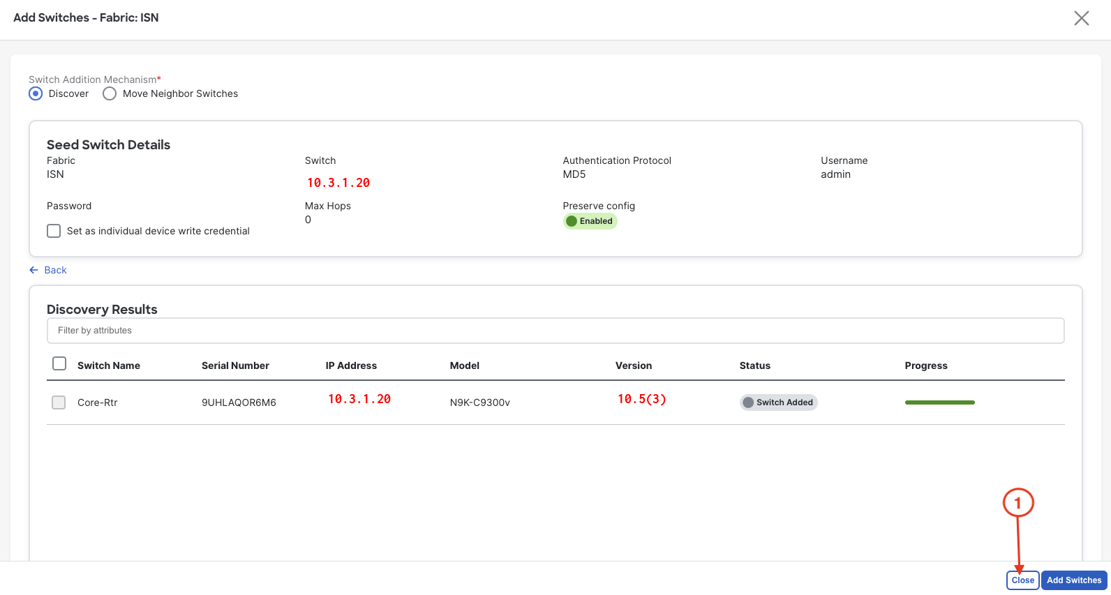 You imported the Core-Rtr into the ISN fabric using the same familiar discovery workflow. Nexus Dashboard's consistent approach across all fabric types — VXLAN, External L3, and ISN — means there's only one process to learn for onboarding any device in your network.