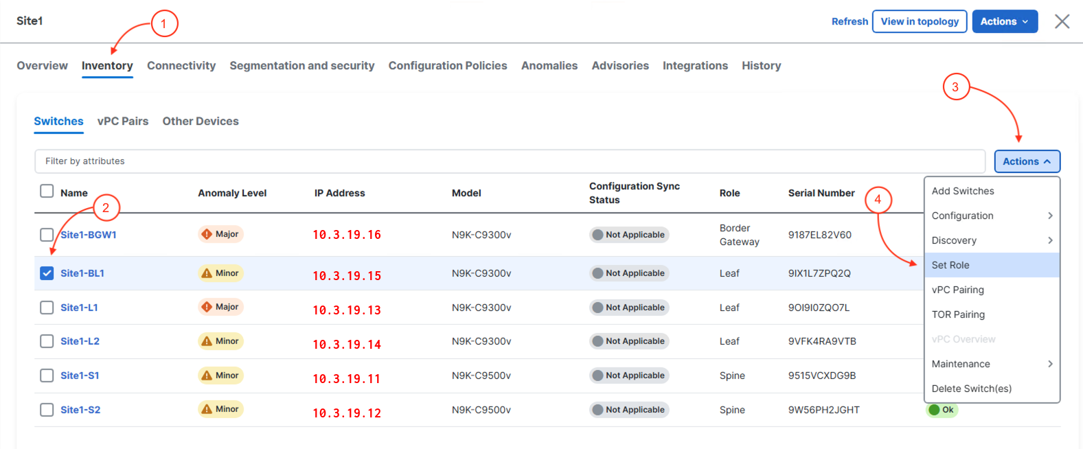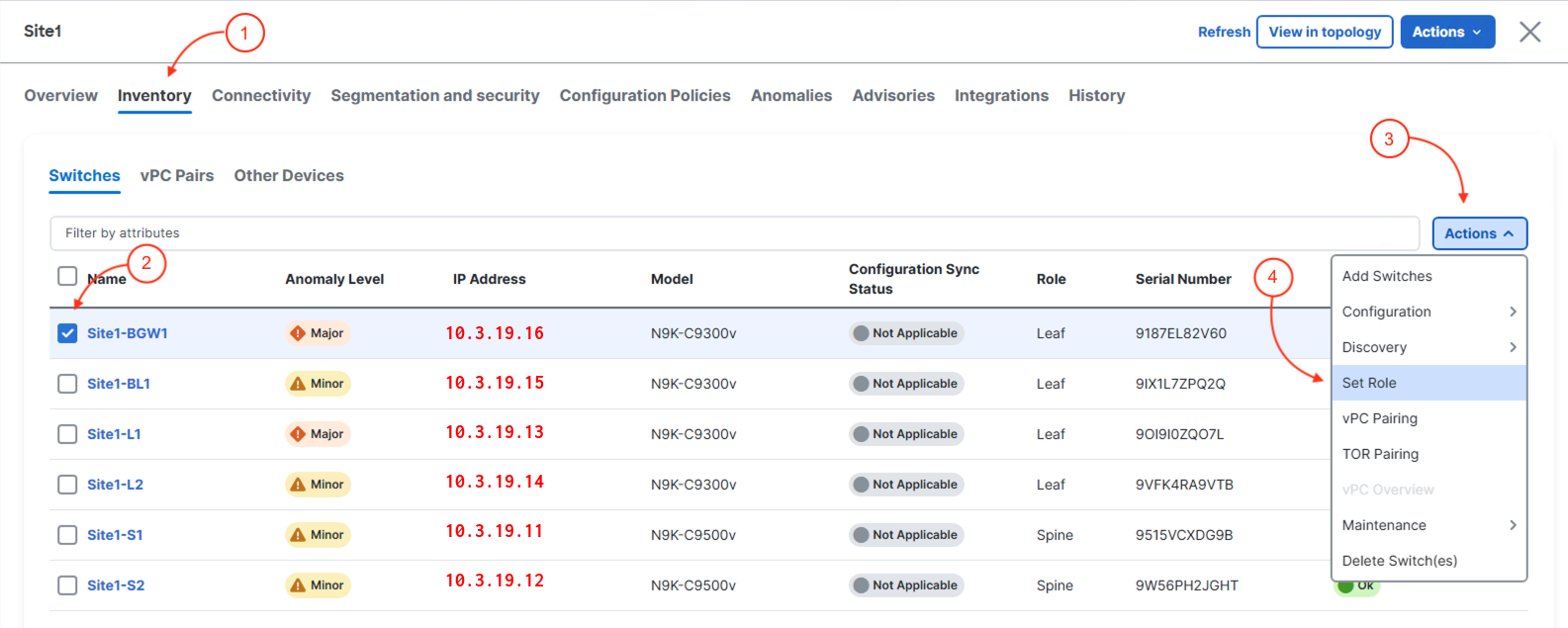 Navigate back to the Inventory view to set the role of the border gateway leaf, Site1-BGW1, correctly: