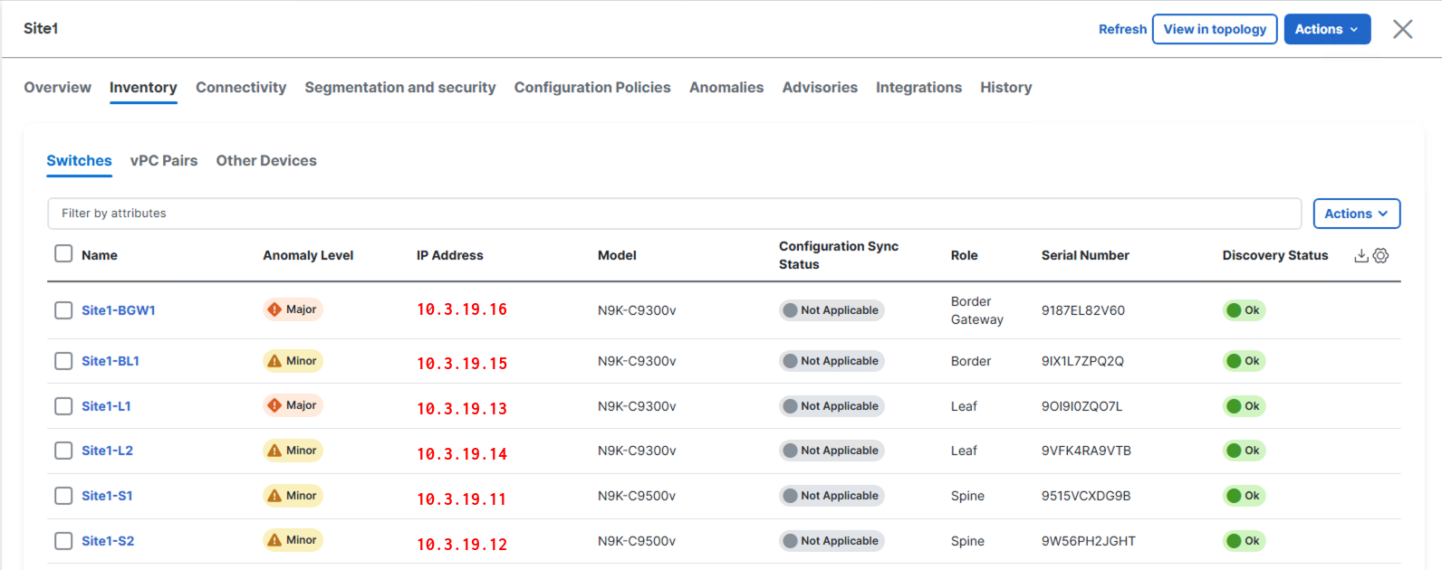 As part of the builtin automation of the discovery and import, default roles are automatically assigned based on the switch model. For Nexus 9300 switches, the default role is set to leaf whereas for Nexus 9500 switches, the default role is set to spine. In a production VXLAN EVPN fabric, these default roles will be correct for the vast majority of the switches in the fabric automatically. The switches that need to assume the roles of border leaf switches or border gateway leaf switches for example, need to have their role set appropriately. Your Site1 Greenfield fabric has a border leaf, Site1-BL1, and a border gateway leaf, Site1-BGW1 that needs their respective roles adjusted.