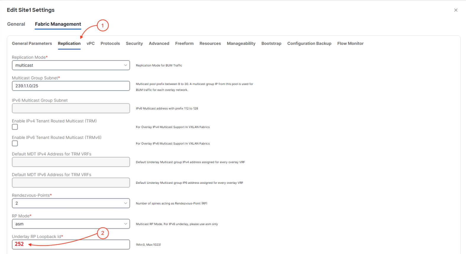Like the Greenfield fabric you created, you will create the same type of "Data Center VXLAN EVPN". When creating the Site2 fabric, you must ensure the