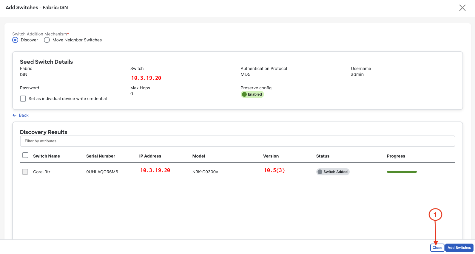 1. Once the switch shows added, click the Close button in the bottom right