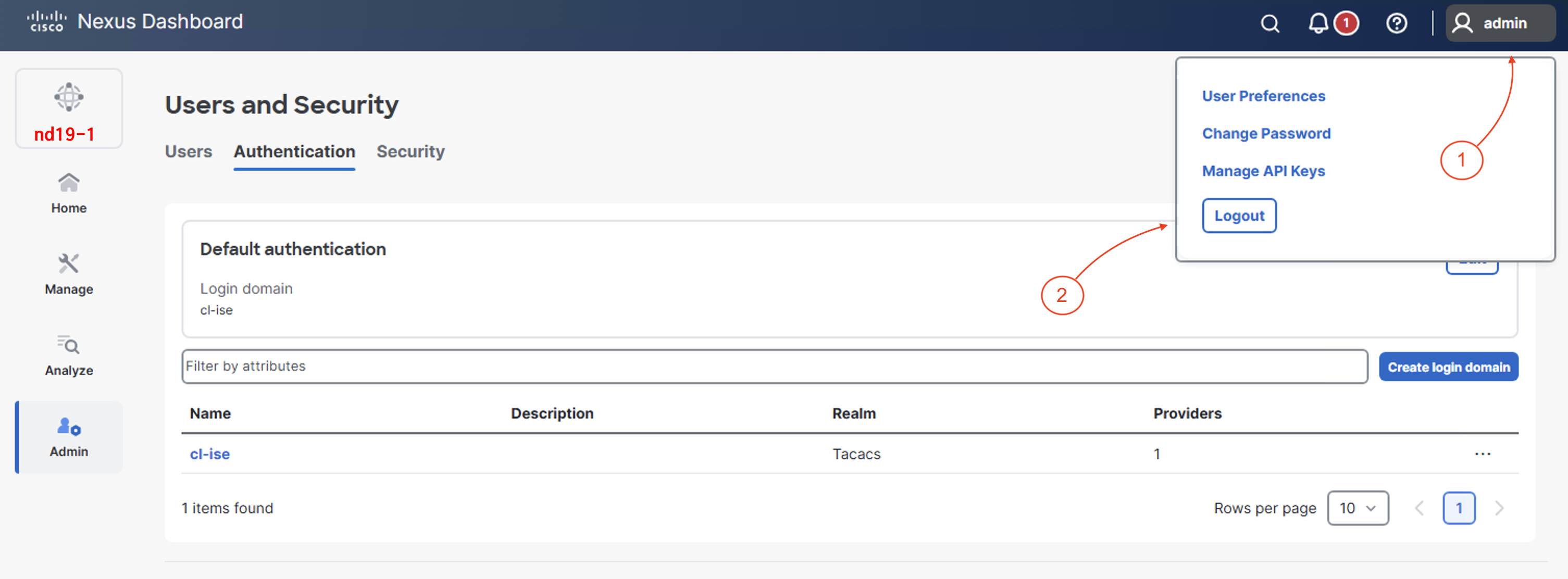 Having configured Role-Based Access Control (RBAC) services on nd19-1, the next step is to validate its functionality. To verify this configuration, log out of nd19-1 and log back in using the appropriate credentials.
