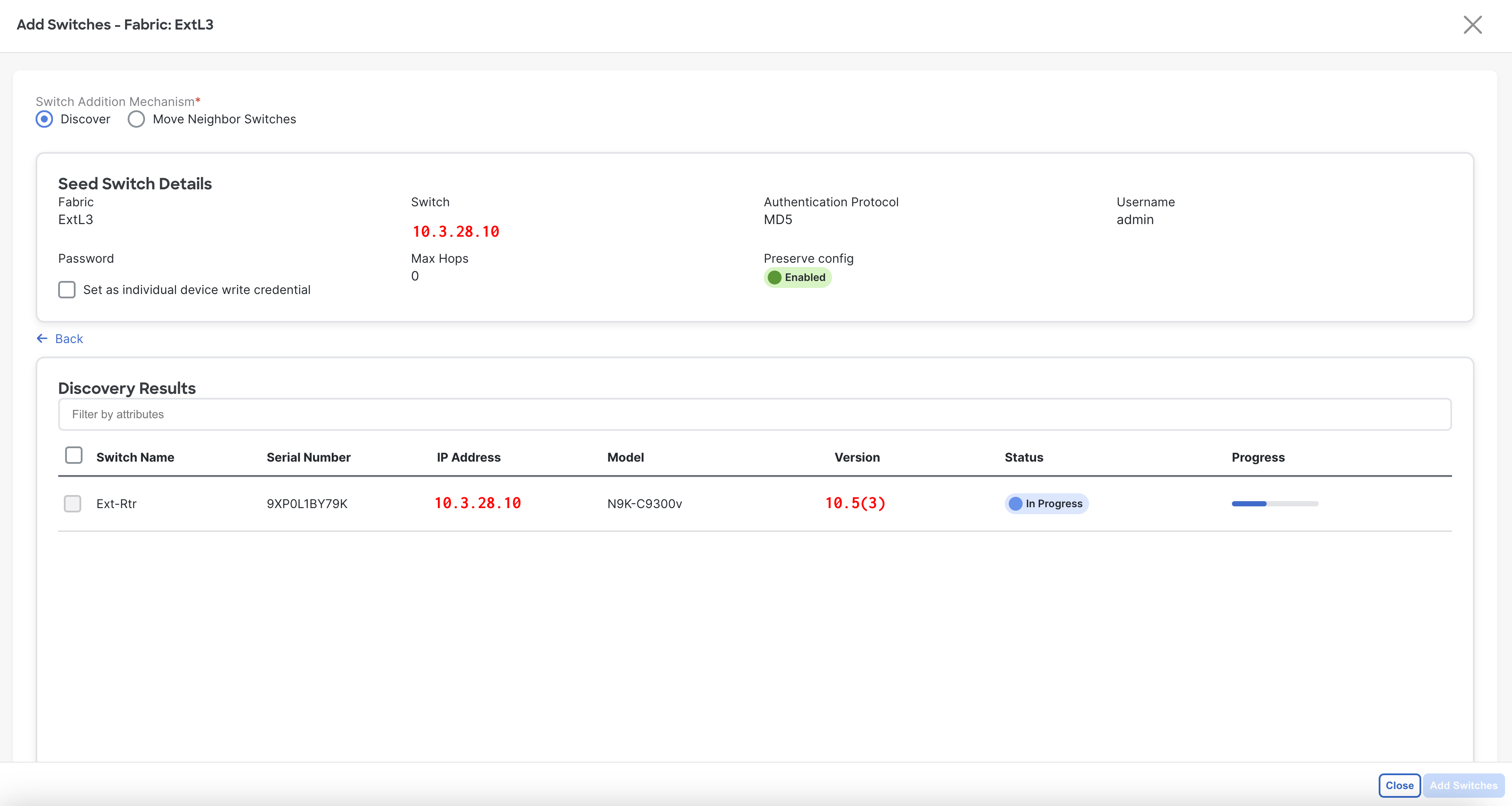 The Add Switches Wizard needs some information to automaticaly be able to discover and add your external device for management by Nexus Dashboard.