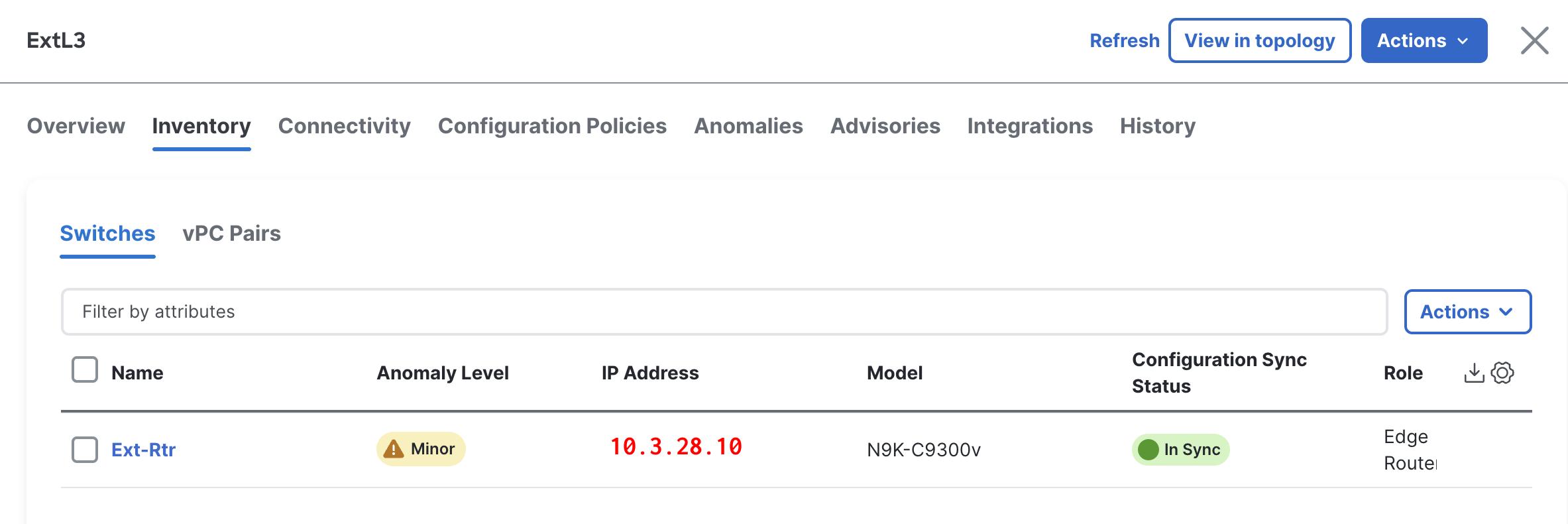 Back at the main Switches overview, your Ext-Rtr device should display a Config Status of In-Sync.