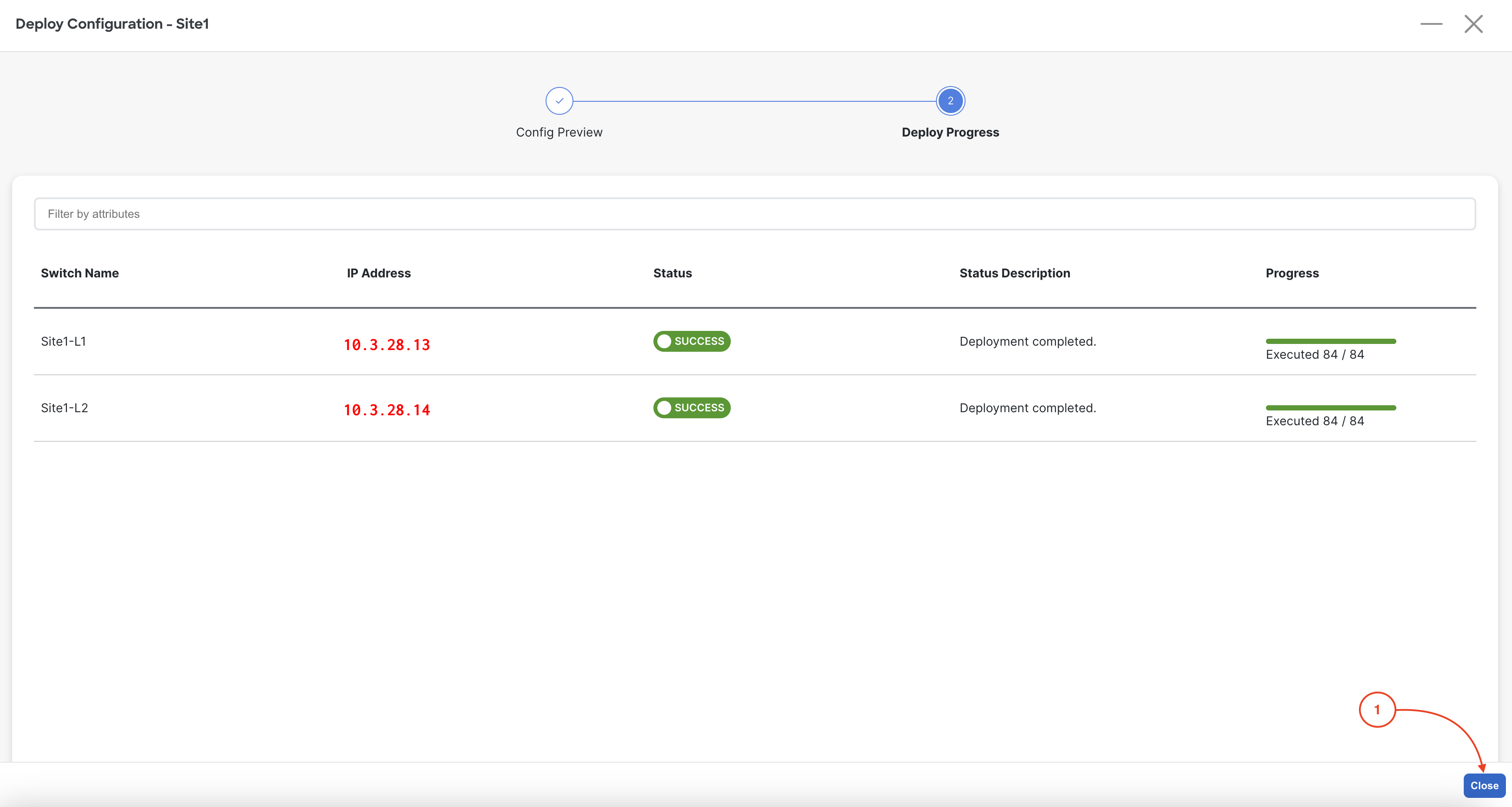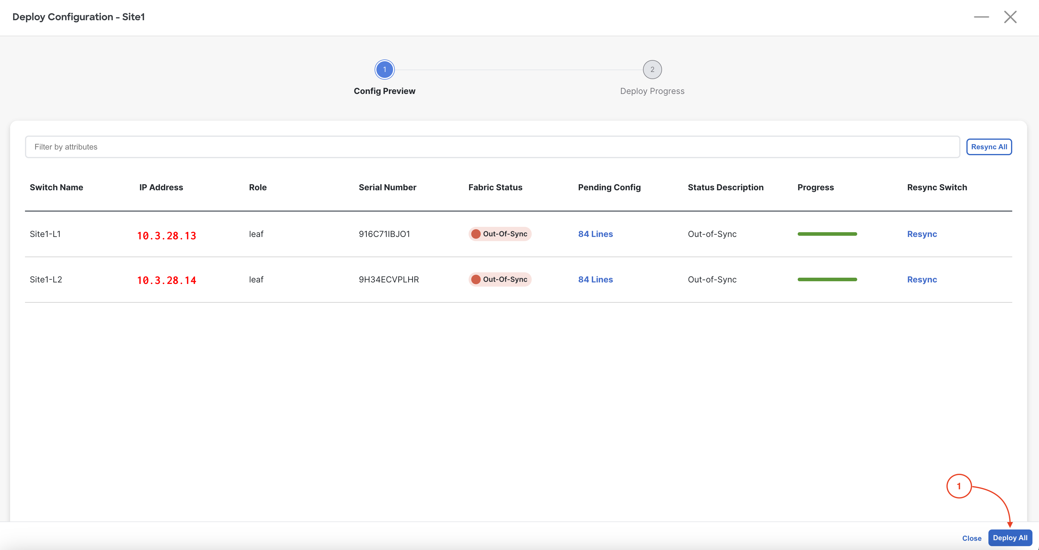 In Nexus Dashboard, you can attach VRFs and Networks to leaf switches independently or combine the workflow as in this lab: first create the VRF, then associate Networks to it, and finally deploy both together, following Cisco best practices. You have already staged your overlay tenant VRF and two host Networks. Now, you need to attach these to the relevant leaf switches—specifically, to the Ethernet1/5 interfaces on Site1-L1 and Site1-L2, where your Linux hosts are connected. During attachment, you select which interfaces (access or trunk) the Networks will use. For this lab, you’ll attach both Networks to Ethernet1/5 on each leaf switch.