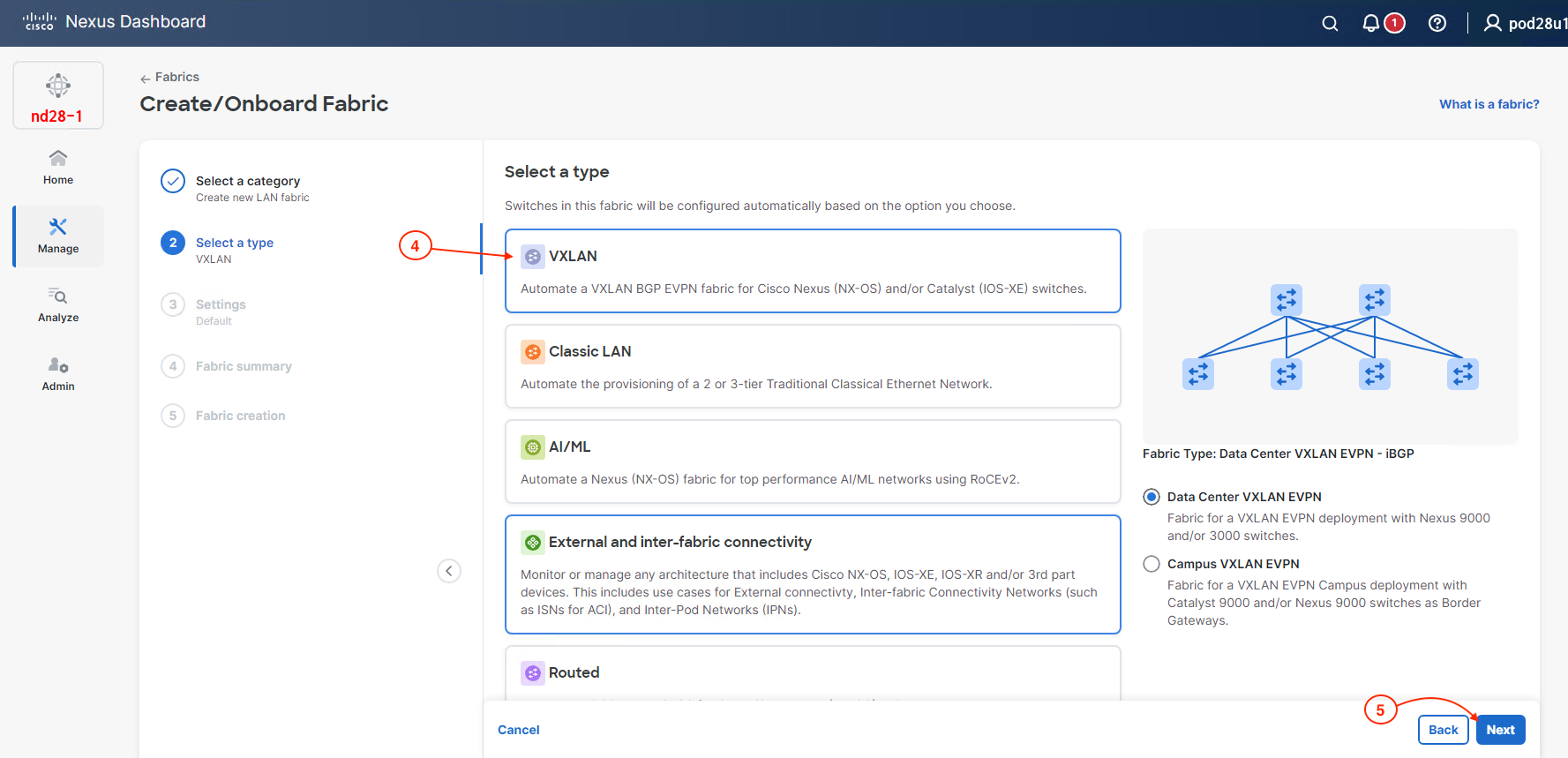 NOTE: We will be using the default VXLAN EVPN fabric which is Data Center