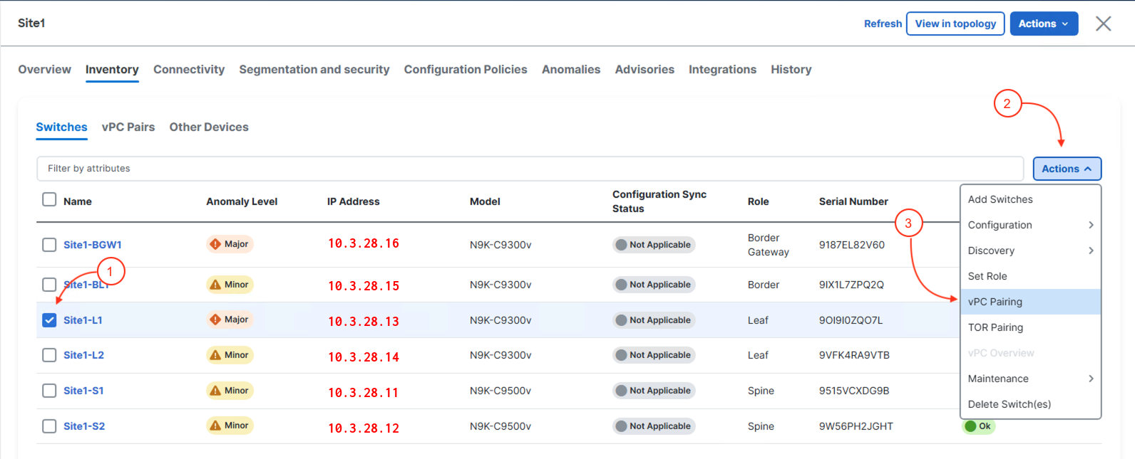 You should still be at the Switches tab. From the Switches tab, you can create vPC pairs between switches simply by working with only one of the switches in the pair. NDFC automatically detects pairs for you.