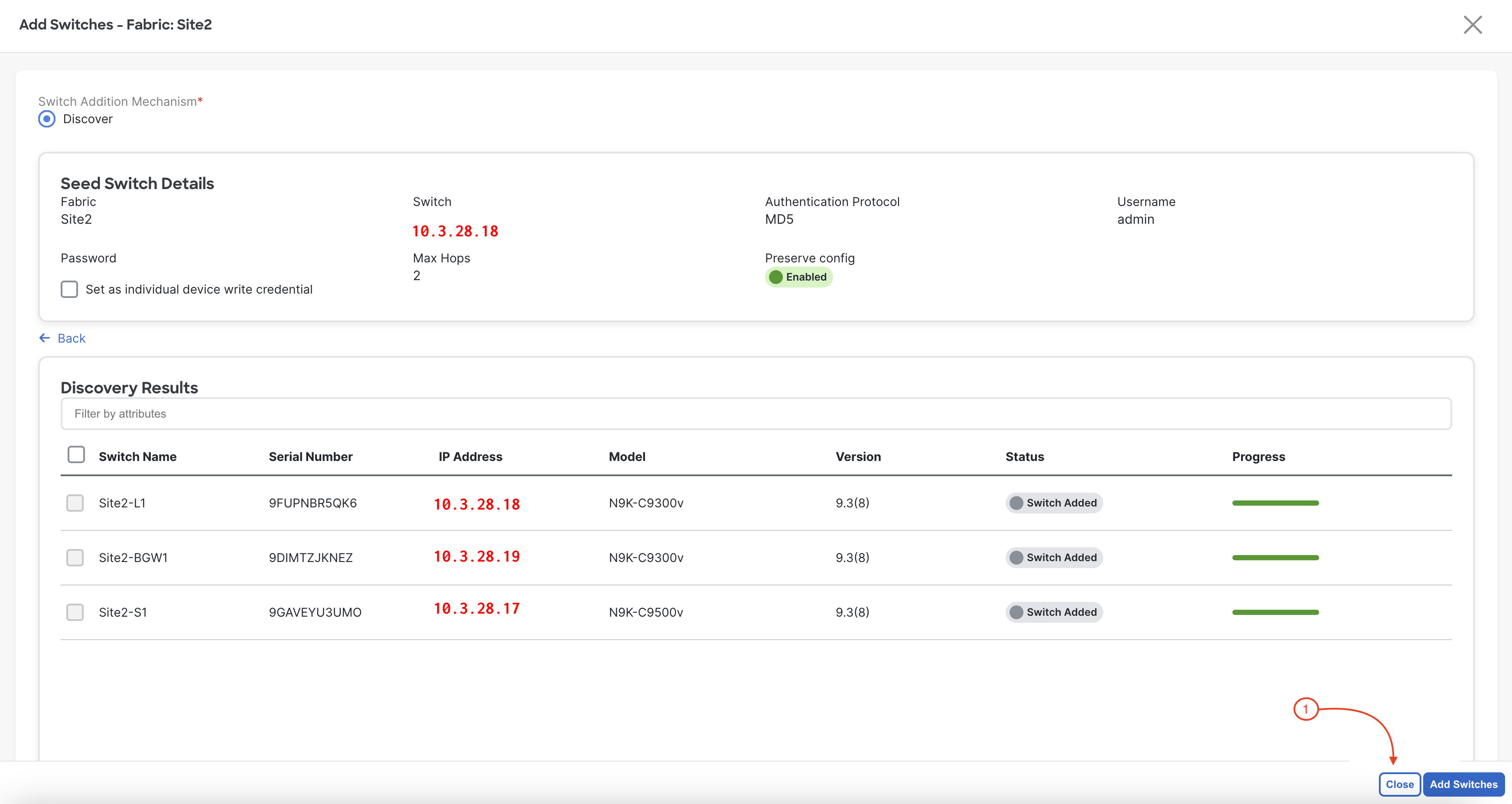 The Add Switches wizard needs some information to automaticaly be able to discover and add switches for management by Nexus Dashboard. Also, since this is a Brownfield fabric, the Preserve Config checkbox will remain checked :