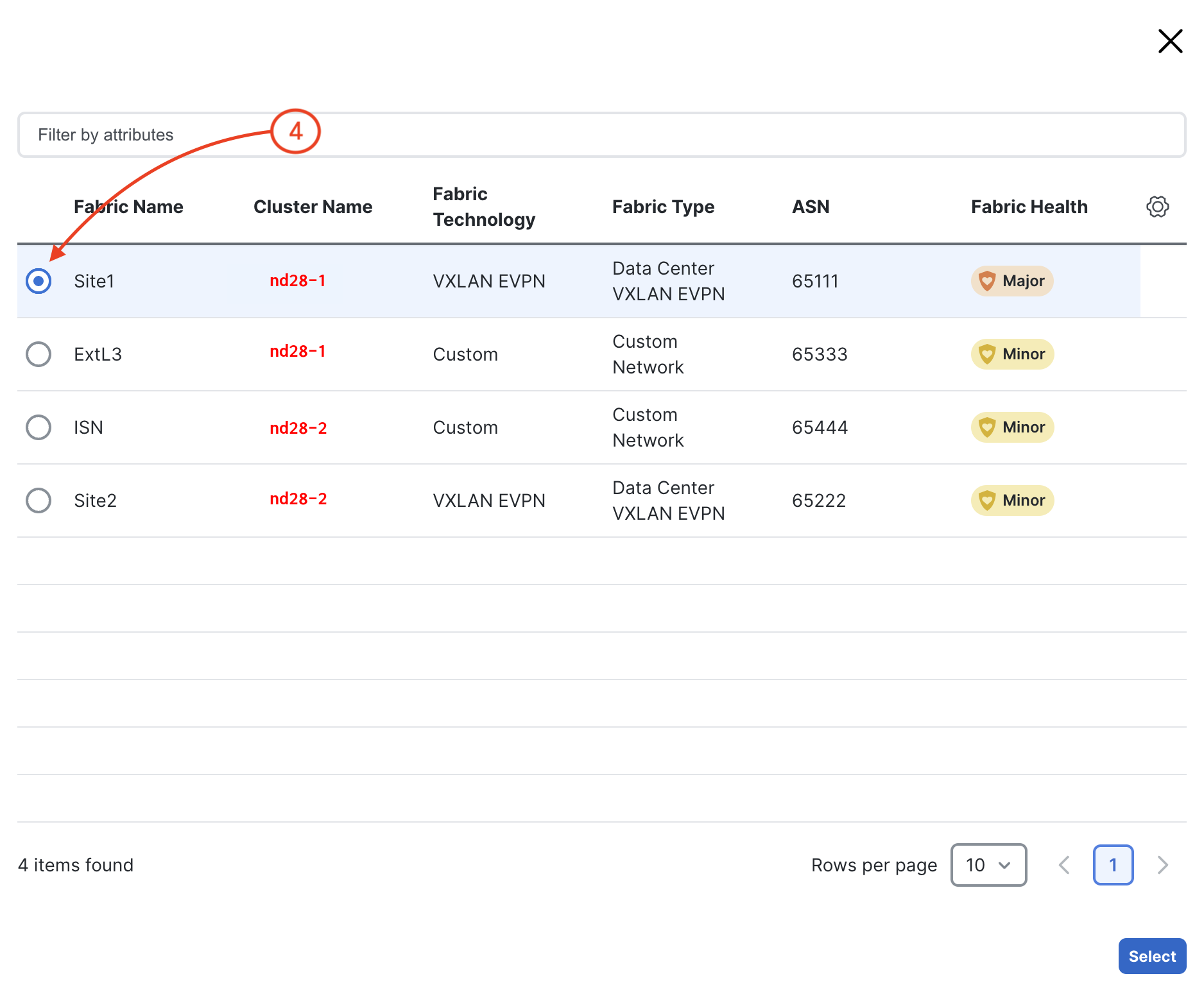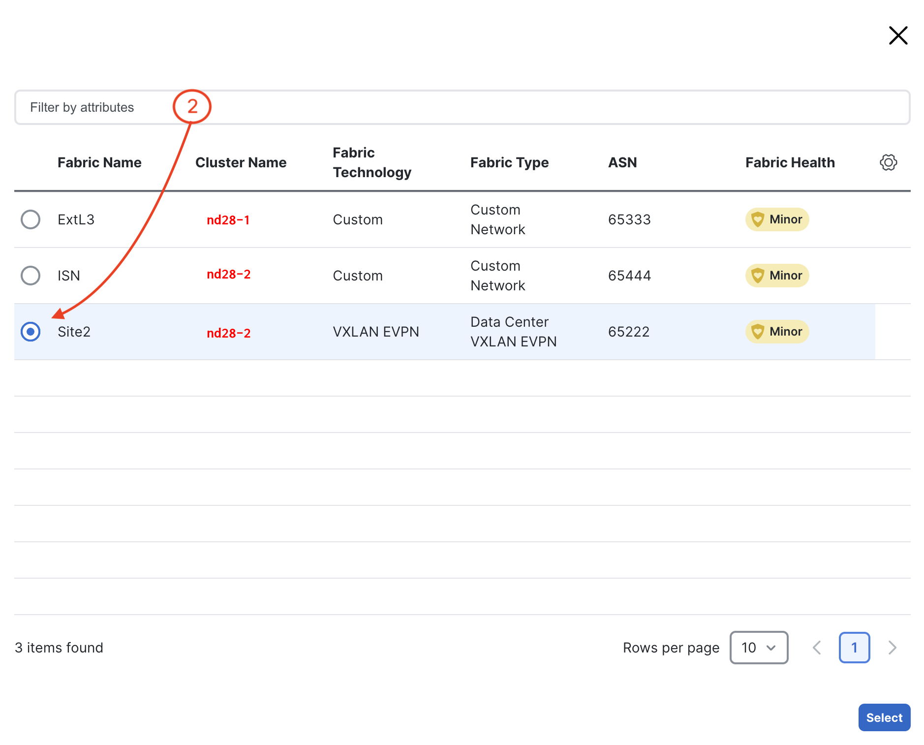 The second fabric you want to select and import is your Site2 fabric. Locate Site2 in the list of fabrics and notice the fabric list has shorted since Site1 was previously selected.
